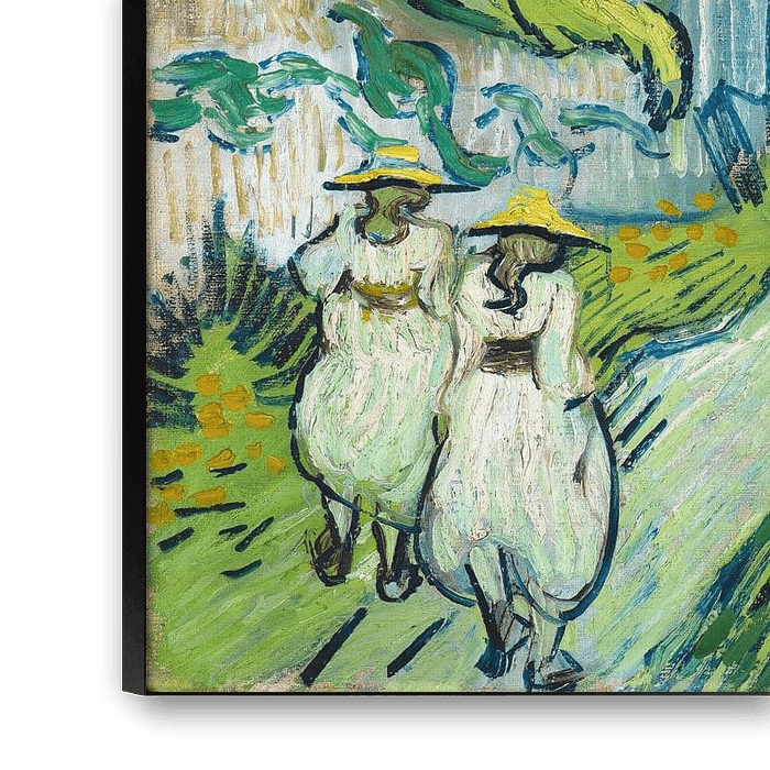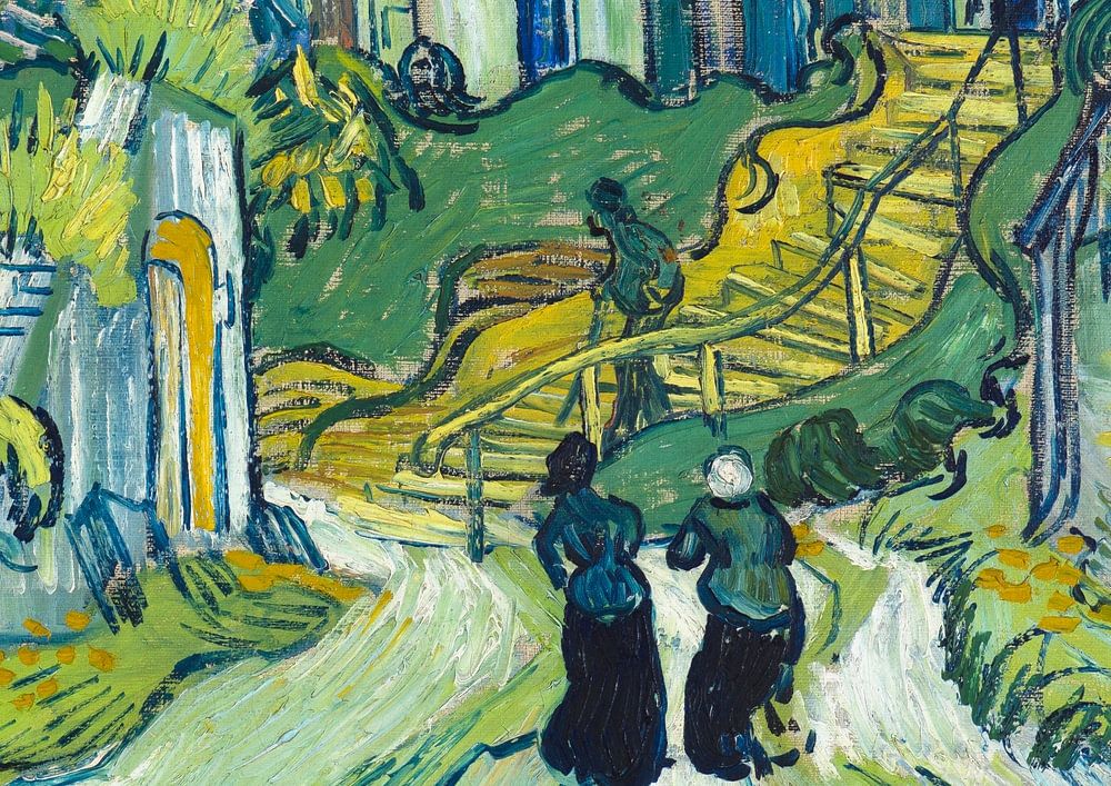 The expressive, swirling lines of the foreground road move backward to the center of the composition and join the base of a stairway on which an elderly man with a stick descends. Chestnut trees are in flower to the right and left, while two pair of women walk along the road. Vincent van Gogh’s work is of a compact, almost claustrophobic density and the sky is barely seen. In one of his final letters, Van Gogh described Auvers as “of a grave beauty, the real countryside, characteristic and picturesque.”