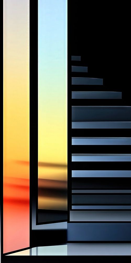 This minimalist, abstract composition shows a stylised staircase rising towards a glowing sunset. Warm light falls through large glass surfaces in gentle gradients, filling the scene with a dreamy, almost surreal mood.