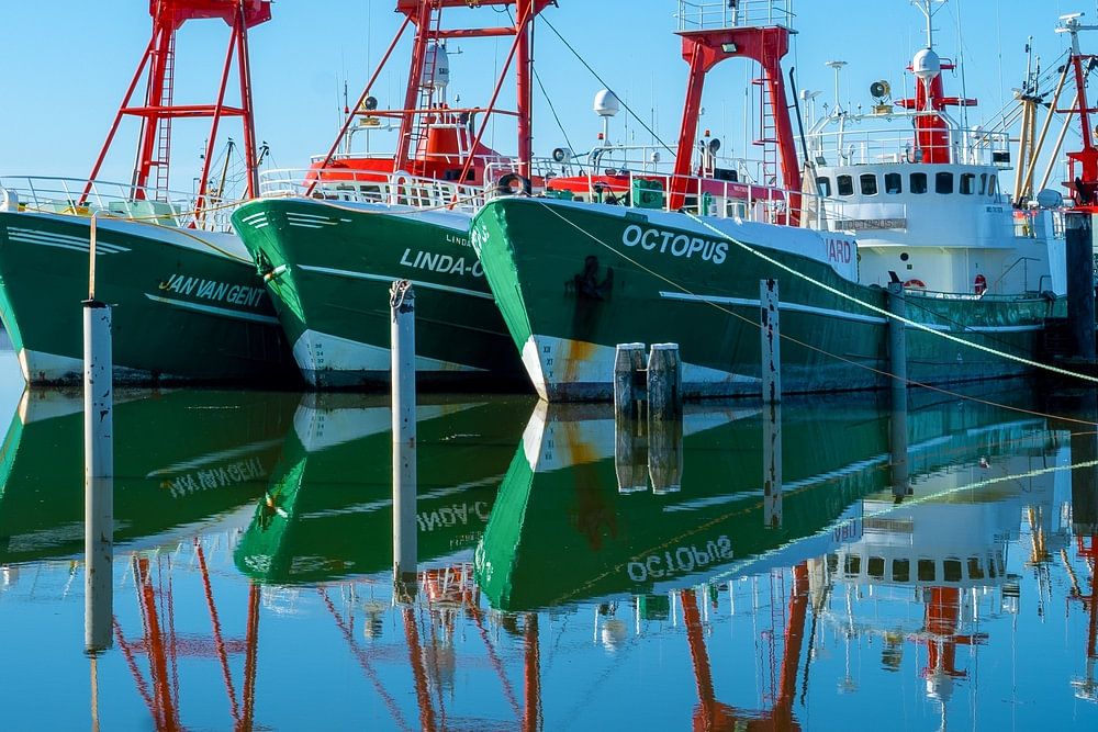Standby Safety Vessel vessels "Jan van Gent", "Linda-C" and "Octopus" in the port of Lauwersoog. Windless so a perfect mirror in the water. Tight blue sky.