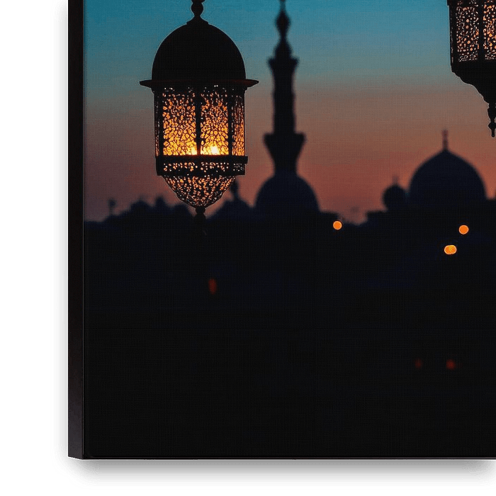 In a mystical interplay of light and shadow, artistically designed lanterns unfold, shimmering in soft golden tones. The fascinating silhouette horizon in the background tells of traditional architecture under a deep blue sky. This work of art lends any living room a warm, inviting atmosphere full of oriental elegance.