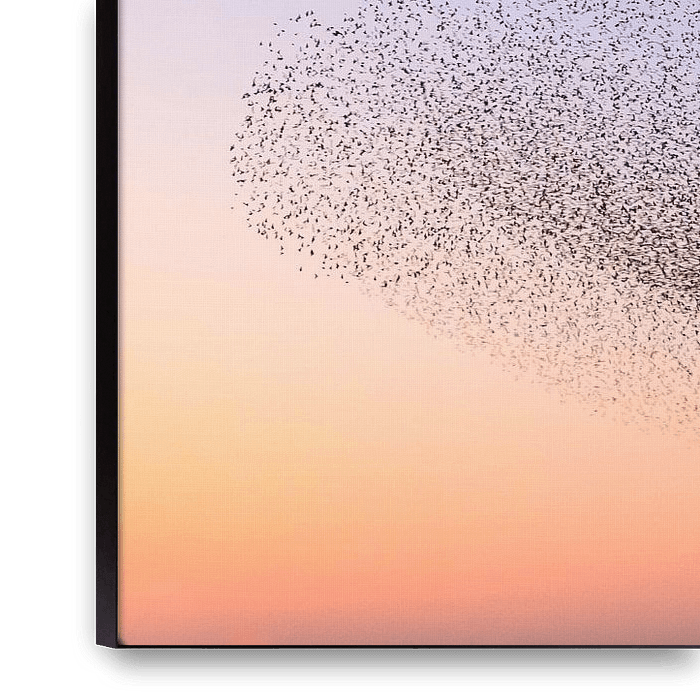 Buy this bird art Starling murmuration during sunset at the end of the day by Sjoerd van der Wal Photography on canvas, ArtFrame, poster and wallpaper, printed on demand in high quality.