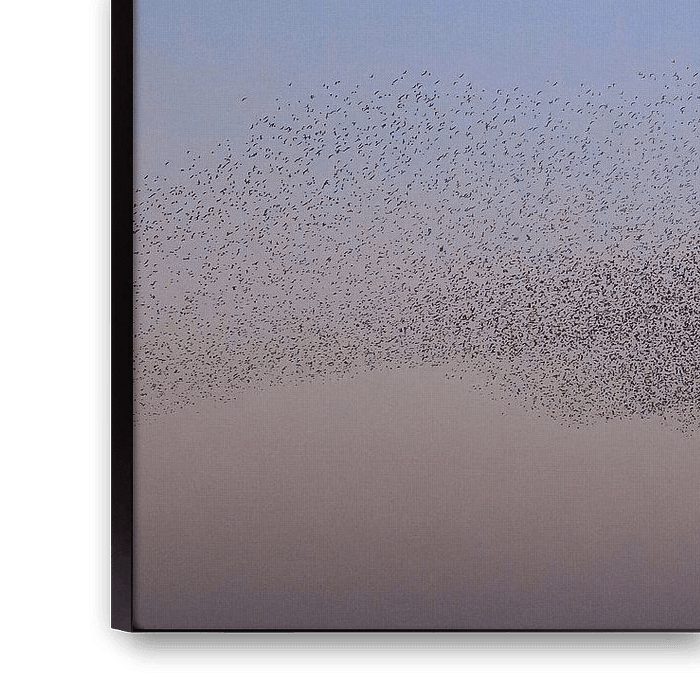 Starling birds murmuration in an cloudy sky during a calm sunset at the end of the day. Huge groups of starlings (Sturnidae) in the sky that move in shape-shifting clouds before the night. The synchronized movements of starling murmurations create mesmerizing patterns in the sky, with the birds swooping, swirling, and diving in unison. The exact reasons behind this behavior are not fully understood, but scientists believe that murmurations serve various purposes, including protection from predators, communication, and coordination of flock movements.These murmurations often occur during the birds' evening roosting time, as they gather together before settling down for the night. Like in this scene above a field of reed plants on the outskirts of Zwolle in Overijssel.