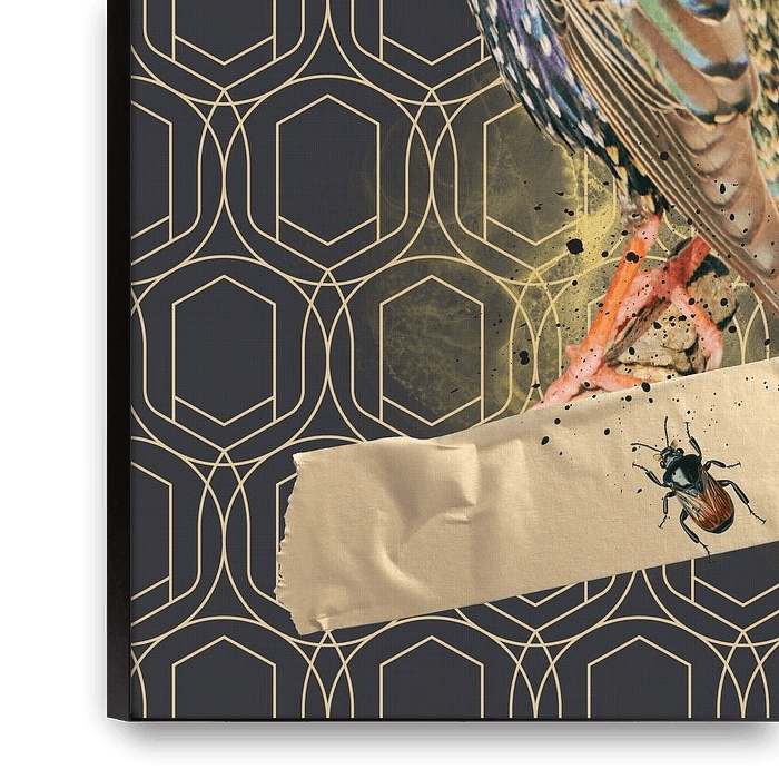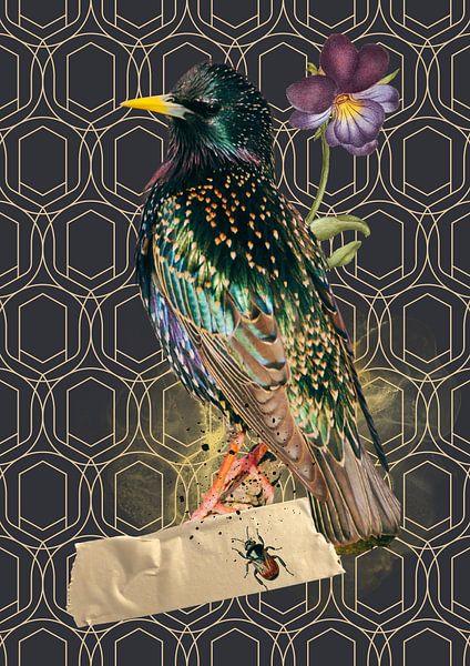 This unique collage puts the starling in the spotlight as a stylish eye-catcher for your interior. The bird is depicted against an elegant geometric wallpaper, creating an exciting contrast between nature and design. The iridescent feathers of the starling come to life through a beautiful colour combination of green, purple, gold and…