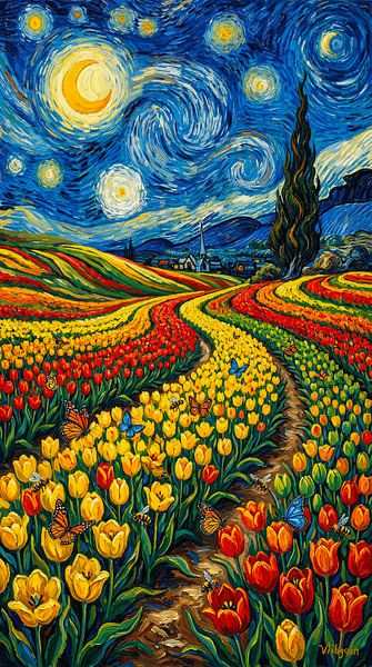 A vibrant landscape illustration inspired by classic post-impressionist painting styles, featuring colorful tulip fields stretching across rolling hills under a dramatic swirling starry night sky. Bright red and yellow tulips fill the foreground while butterflies and bees add life to the scene. A small countryside village and tall…
