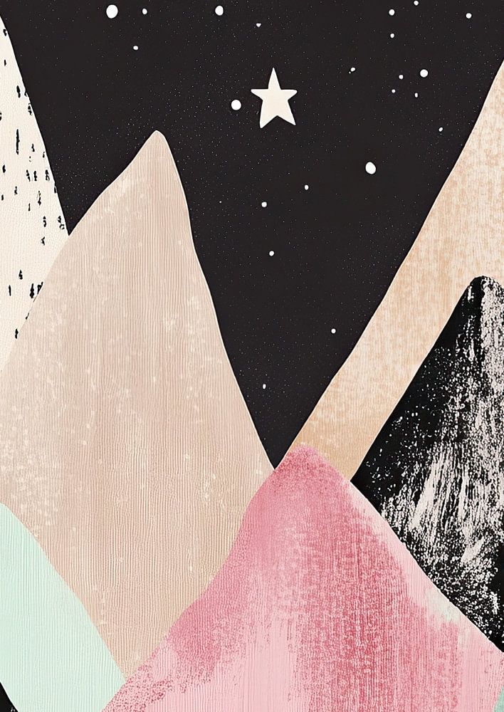 A cute illustration of pastel-coloured mountains with stars and a moon, a minimalist vintage-style design with simple shapes, a hand-drawn texture and clipart on a black background. The image is high resolution, high quality and very detailed.