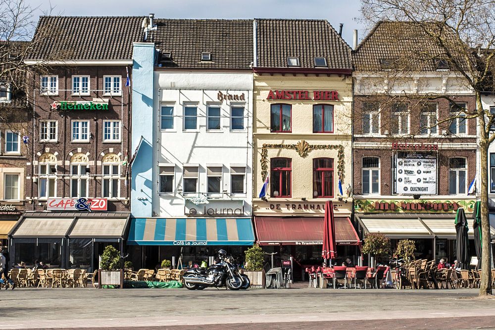 Stationsplein in centrum van Roermond. Op dit plein vinden vaak grote feesten plaats, er zijn veel eetgelegenheden en café's met uitgebreide terrassen.