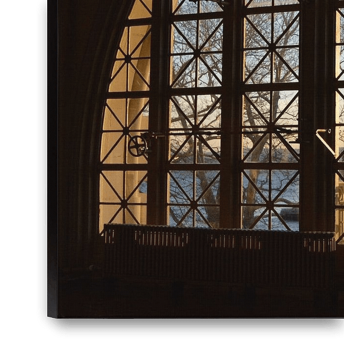 Through a large arched window opening with a geometric grid, you can see the silhouette of the iconic Statue of Liberty in the distance, as seen from Ellis Island. The warm glow of the setting sun illuminates the scene, enhancing the contrast between the dark interior and the radiant view outside. This photograph captures a powerful…