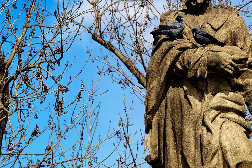 A statue where the birds sit on the man's arm. The statue stands on Charles Bridge in Prague.