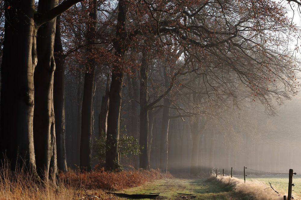 landscape on the estate of Staverden, with a view on a footpath in the morning sun, on a misty winter morning