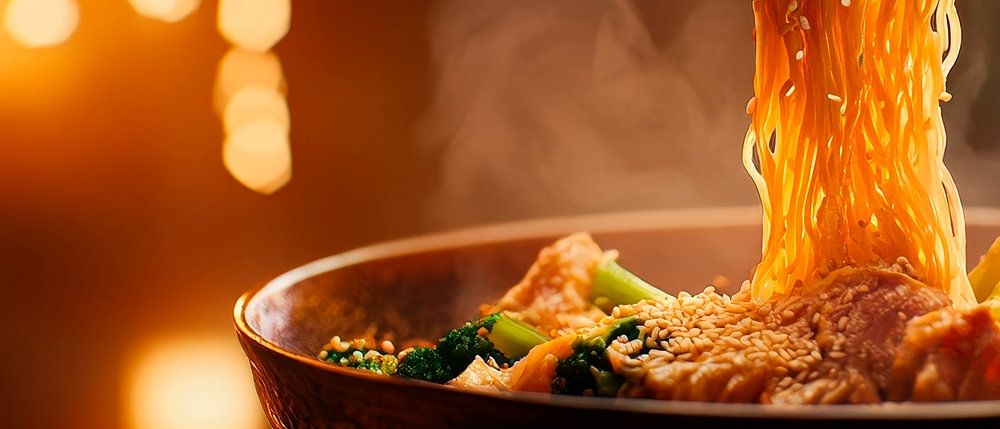 A tempting pasta dish steams invitingly from its bowl, framed by soft lighting and warm colours that create a cosy atmosphere. The crunchy pieces of vegetables and colourful spices give the dish that certain something. Perfect for the kitchen or dining room to whet the appetite and encourage inviting conversation.
