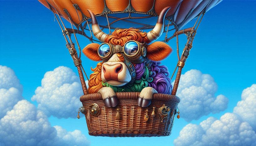 Steampunk Balloon Cow Adventurer is a cheerful, imaginative and striking work of art in which a colourful cow takes centre stage in a world full of retro-futuristic charm. The cow wears large steampunk flying goggles and leather armour, immediately evoking the iconic steampunk art aesthetic. She sits in a richly detailed hot air balloon…