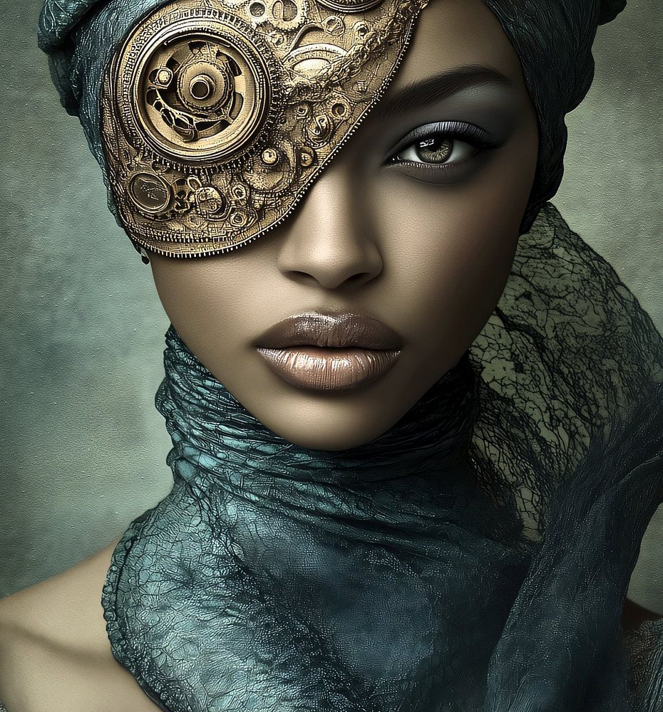 Portrait of a woman in shades of green and teal with gold steampunk elements.