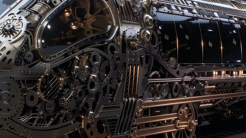 The bronze-coloured locomotive is an impressive interplay of gears, screws and intricate mechanical structures. The vehicle exudes a sense of power and elegance, while its detailed construction and warm, shiny bronze tones evoke a nostalgic sense of industrial revolution. The combination of dark and light elements accentuates the complexity and craftsmanship put into every part of the train.