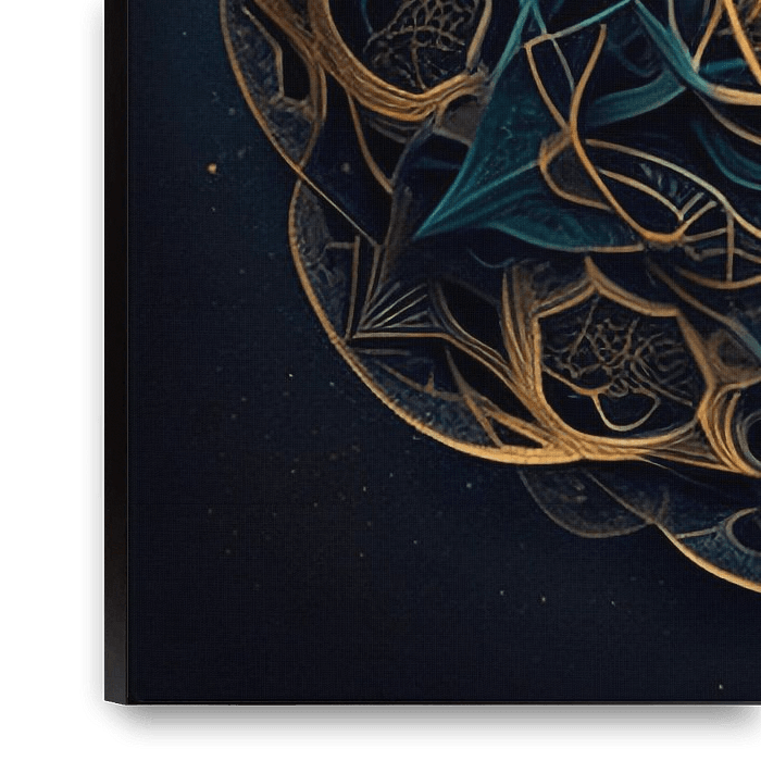 "Stellar Harmony" is a fascinating geometric mandala made up of intertwined shapes in rich gold and blue tones. Intertwined star-shaped patterns radiate from the centre, creating a harmonious and symmetrical design that captures the viewer's attention. The sophisticated colour palette and intricate details convey a sense of balance,…