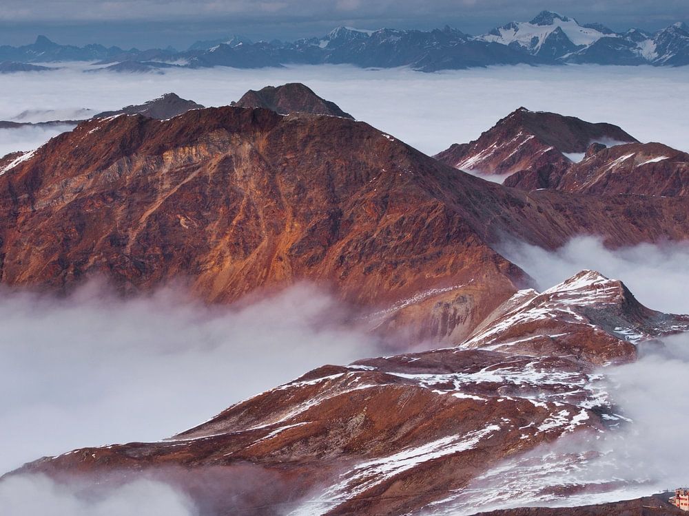Italy, Lombardy, Stelvio Pass National Park, view from Monte Scorluzzo, Rifugio C. Garibaldi, Rötlspitz, in the background the Ötztal Alps