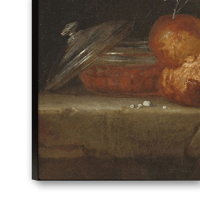 A glass bowl, a brioche, a basket of peaches and a bunch of horseradishes have been arranged against a dark background on a cracked marble slab. The refined simplicity of the picture is typical of Anne Vallayer-Coster – one of the most successful women artists of 18th-century France. The still-life painting of Chardin, which dominated the first half of the century, was an important starting point for her art. But Vallayer-Coster developed a style of her own, with freer brushwork and a more nuanced palette.