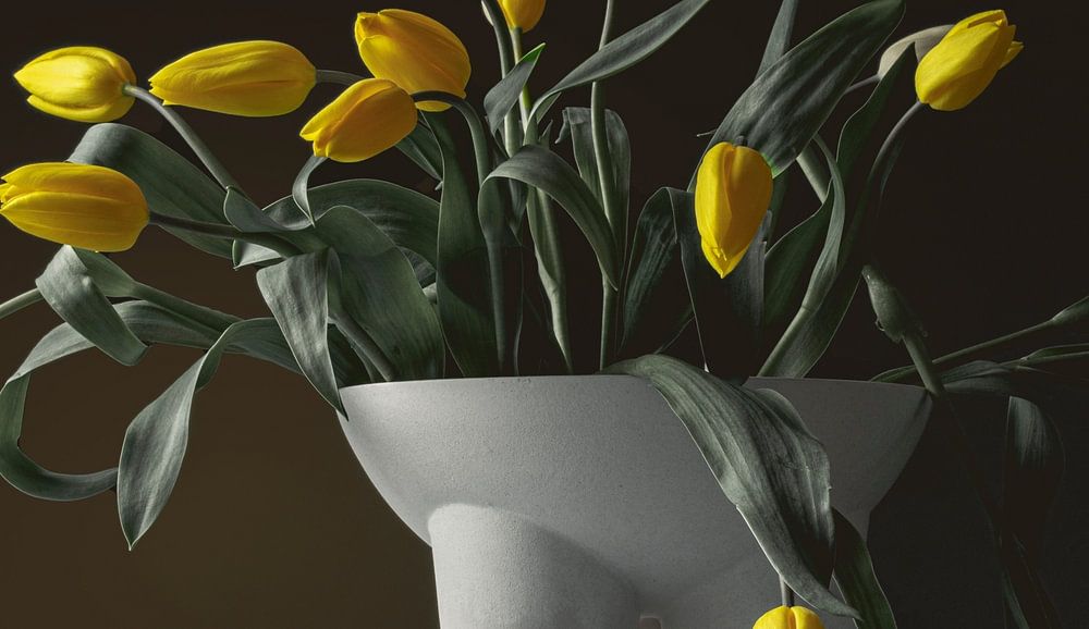 Still life horizontal almost black and white photograph of the Schaas (in white) containing yellow tulips and accompanying a special whitish oyster shell with scaly texture that fits wonderfully with the matte 'skin' of the Schaas. All against a dark background.