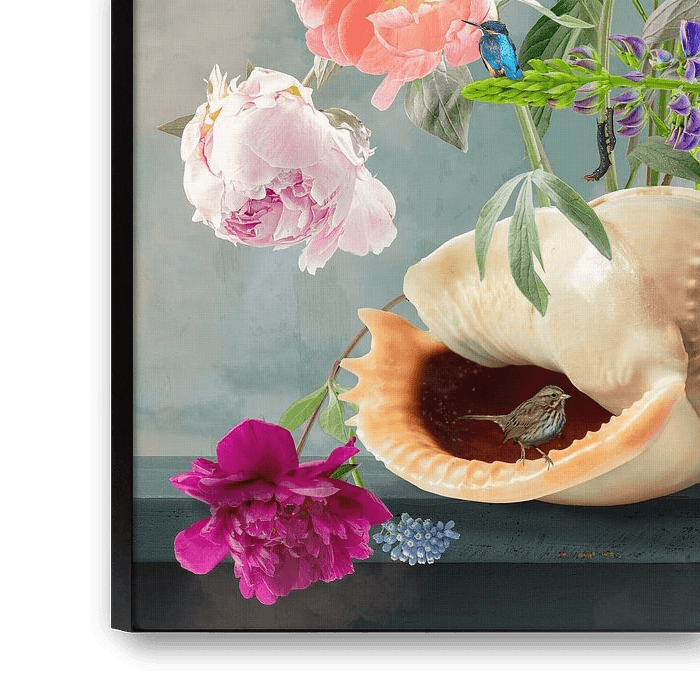 Still life vertical photo collage of a large shell with peonies, lupine, rapeseed, daisies and blue grapes behind it. The shell lies on a sea blue table and in the background you can see a sky and faint paint leaves.