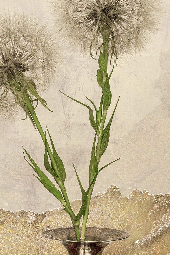 Fluff balls together in a metal vase.