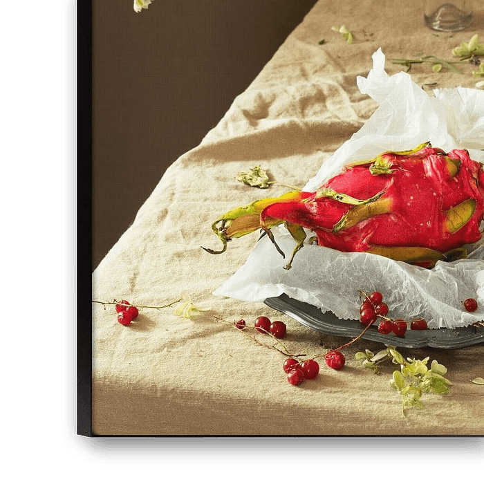 Still life photo vertical of a Pitahaya on a piece of white paper on a tin plate. Together with a crystal glass and a sprig of Lilac flowers on a table with a neutral linen tablecloth. Against a dark background.