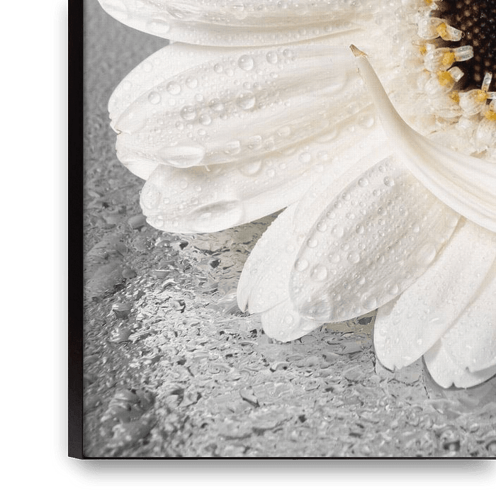 Buy this flower art Still life: White Gerbera with loose petal with a drop by Marjolijn van den Berg on canvas, ArtFrame, poster and wallpaper, printed on demand in high quality.