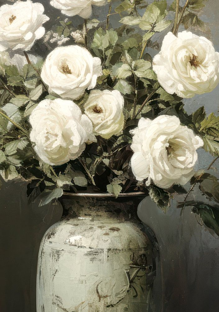 This painting evokes a sense of nostalgia and stillness. The few colours, mainly white, convey an understated beauty and tranquil atmosphere. The antique character adds an extra layer of history and timelessness to the still life, as if it is keeping a secret from a distant past.