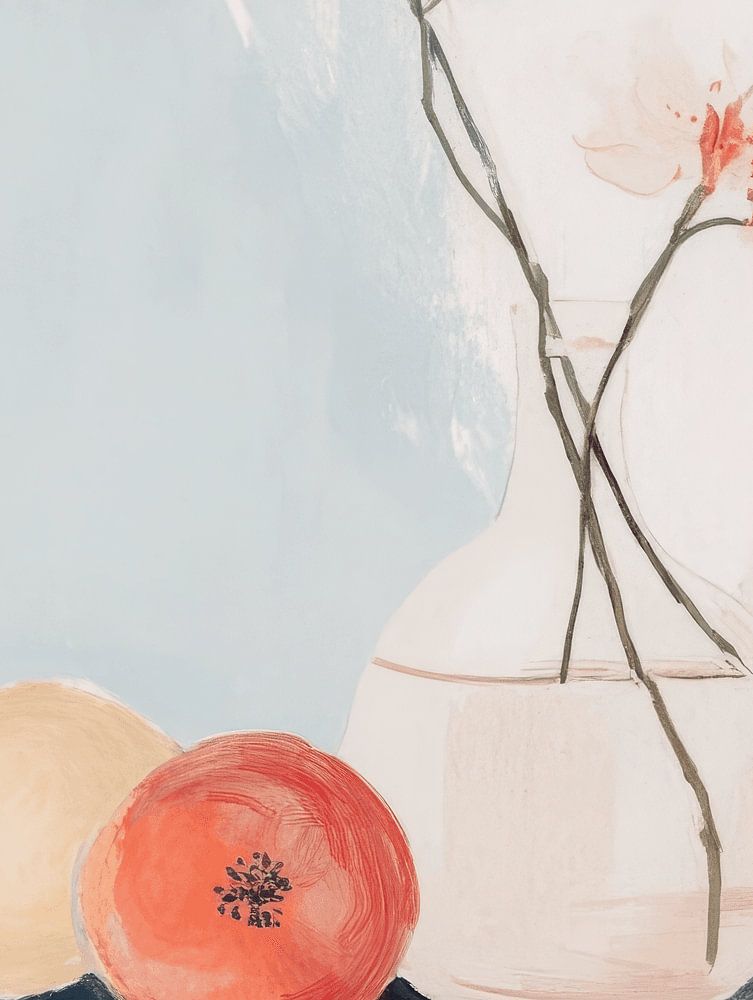 Still life in Japandi style, pastel colours. A vase with flowers in fruit. A special eye-catcher for your interior! Choose the size and material for this work and make it your own.