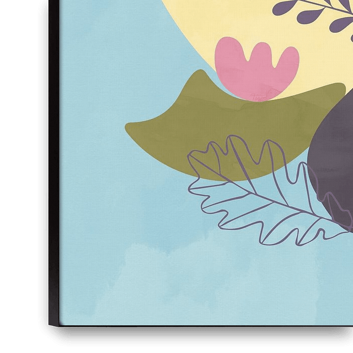 Minimalist still life of a flower and leaves in a vase, surrounded by organic shapes and another leaf. The colours - light yellow, pink, green, aqua blue and purple - are inspired by spring.