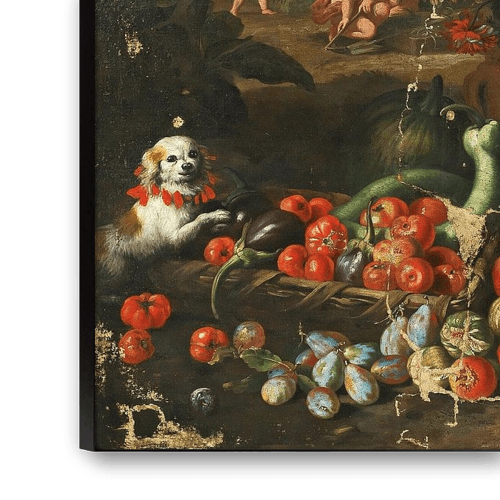 About "Still life of flowers with fruits, putti and animals, Abraham Brueghel"