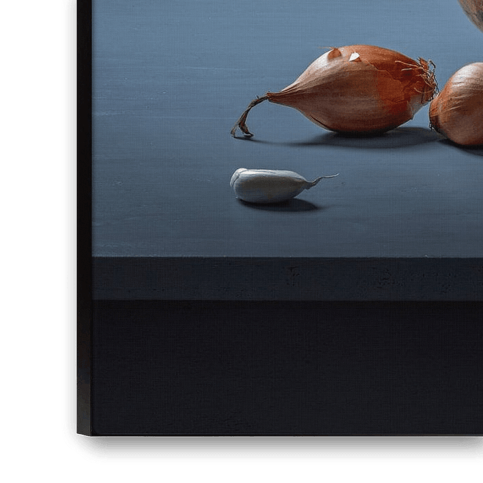 Pure and sober still life of a copper pot with onions, shallots and garlic on a grey-blue table just a little bit out of the middle; more to the left. With on the left two shallots and a clove of garlic. He still life is predominantly in shades of greyish brown and blue.