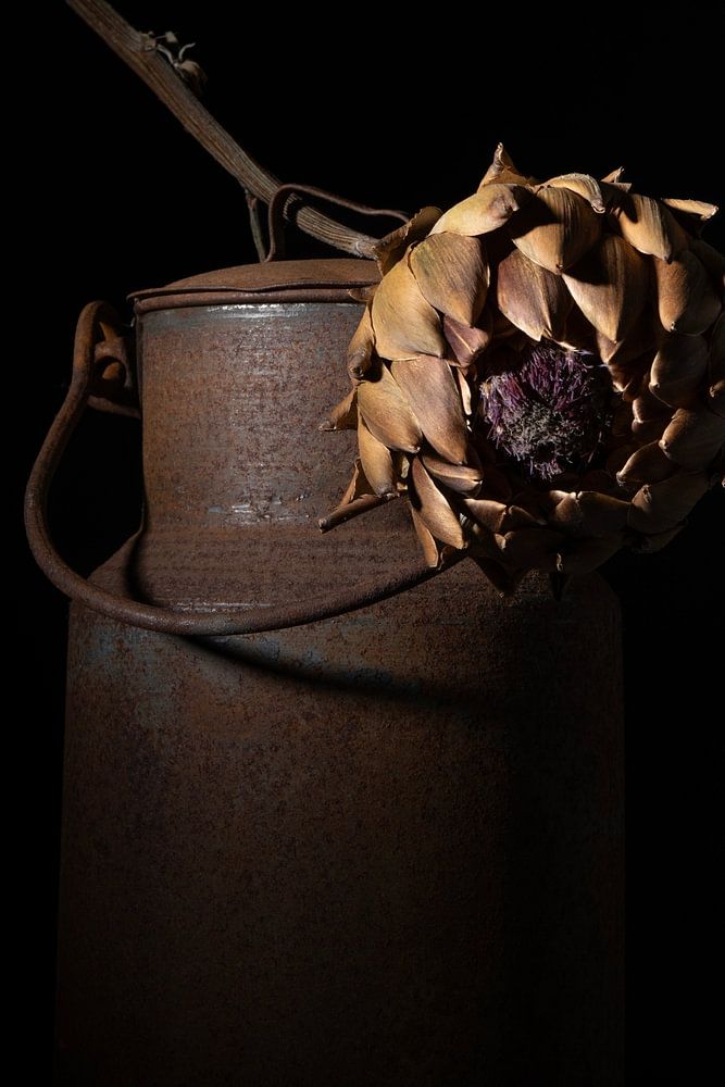 Old milk can with a dried artichoke in low light creating an atmospheric image. Classic and timeless.