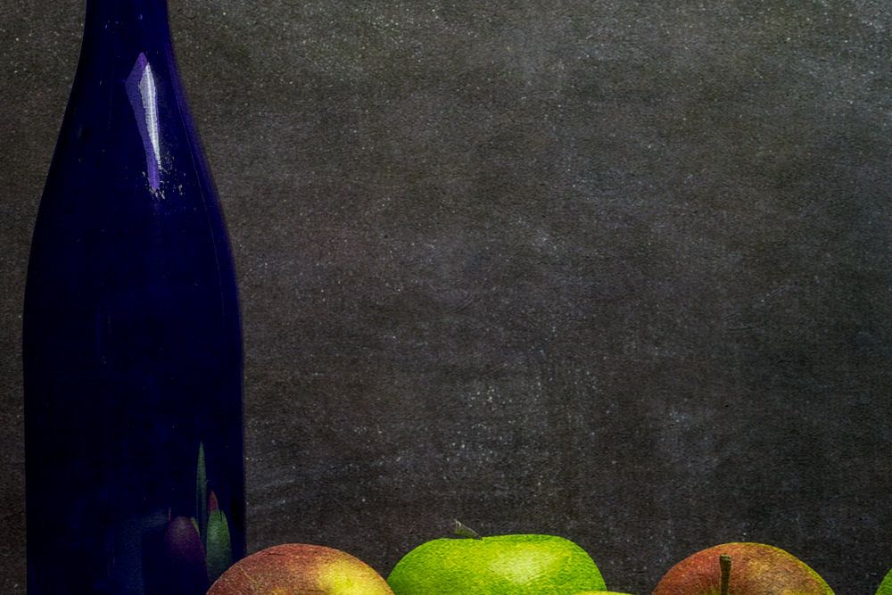 A tableau of green and red apples combined with a bottle in an environment where the light is subdued from above, creating a captivating whole.