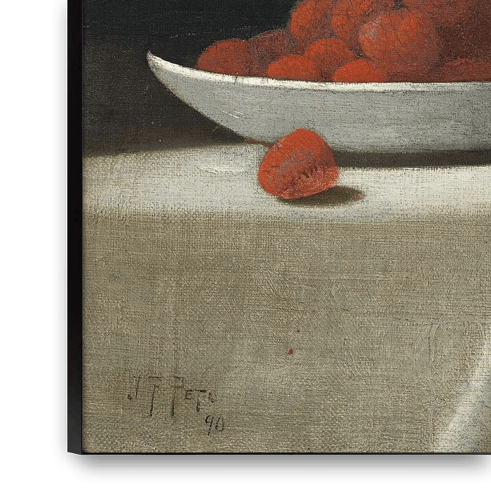 Buy Still life with cake, lemon strawberries and glass, John Frederick Peto as a reproduction on canvas, ArtFrame, poster and wallpaper, printed on demand in high quality.