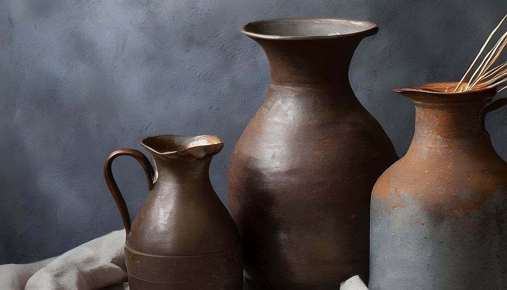 This picture shows a still life with metal vases and jars with rust, placed in front of a rough dark grey wall. The weathered texture of both the wall and the metal objects creates a rustic and authentic atmosphere. The contrast between the rough surface of the wall and the weathered sheen of the vases and jars gives the picture a captivating visual dynamic. The whole exudes a sense of timelessness and character, perfect for a decorative accent in an industrial or vintage interior. The accents of the colourful but warm pampas grass and the shabby cotton canvas create a rustic atmosphere.