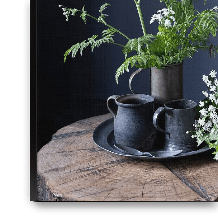 Still life with cow parsley and pewter on wood. This photograph is also available in a square and rectangular landscape in the web shop.
