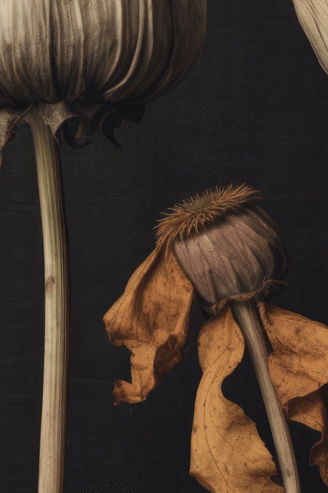 Still life with dried flowers, flatlay. This is a digitally composed work. Earth tones. Fits any interior, from very modern to more rural.
