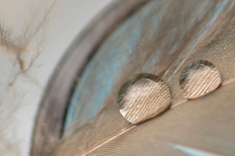 This downy feather had drops on it. Nice to see how the drops enhance the structure of the feather. The feather itself is also clearly visible thanks to the use of the macro lens. A peaceful still life in brown and blue tones. Does well in a bedroom or living room. And fits well in a rural interior.