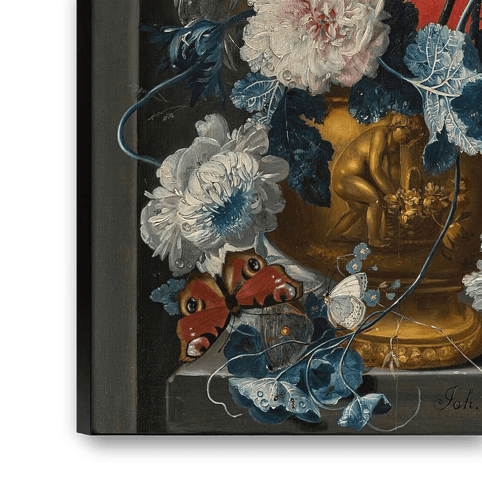 Buy Still life with flowers in a sculpted bronze urn with butterflies in an alcove, Johann Baptist Drech as a reproduction on canvas, ArtFrame, poster and wallpaper, printed on demand in high quality.