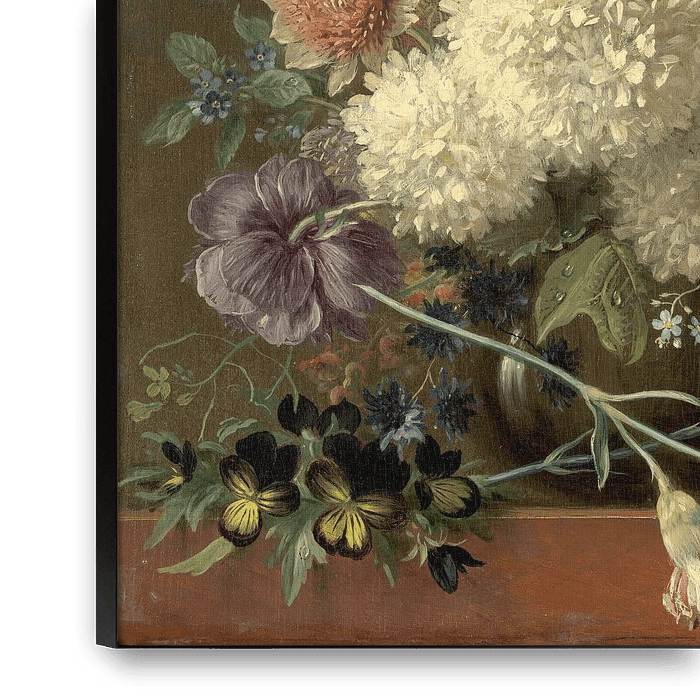 Still life with flowers in a vase by Georgius Jacobus Johannes van Os. Painted around 1850. On this picture you will find a combination of flowers such as carnations, violets and dahlias. Together a colorful whole!