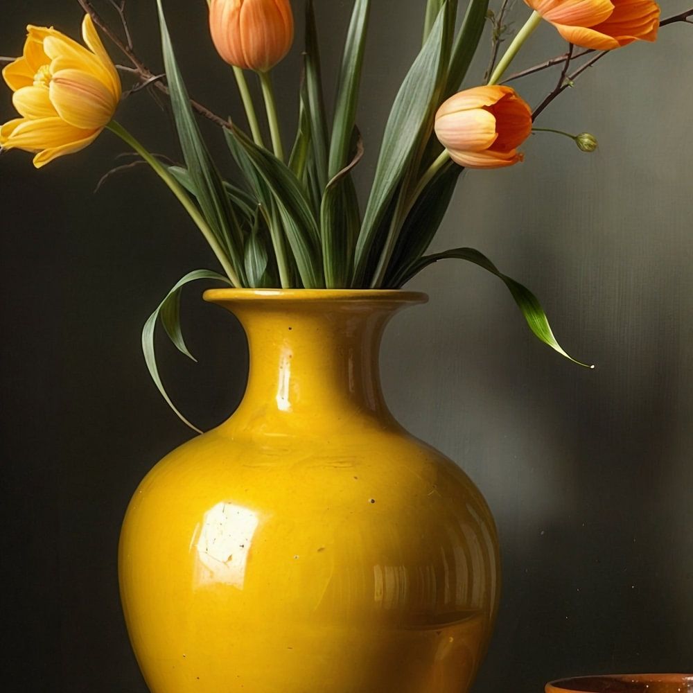 The painting shows a still life of a yellow vase with yellow tulips and dainty twigs, placed on an old wooden wall shelf. The deep colours of the flowers contrast with the weathered shelf and dark background. The light subtly captures the textures, creating an intimate, timeless atmosphere.