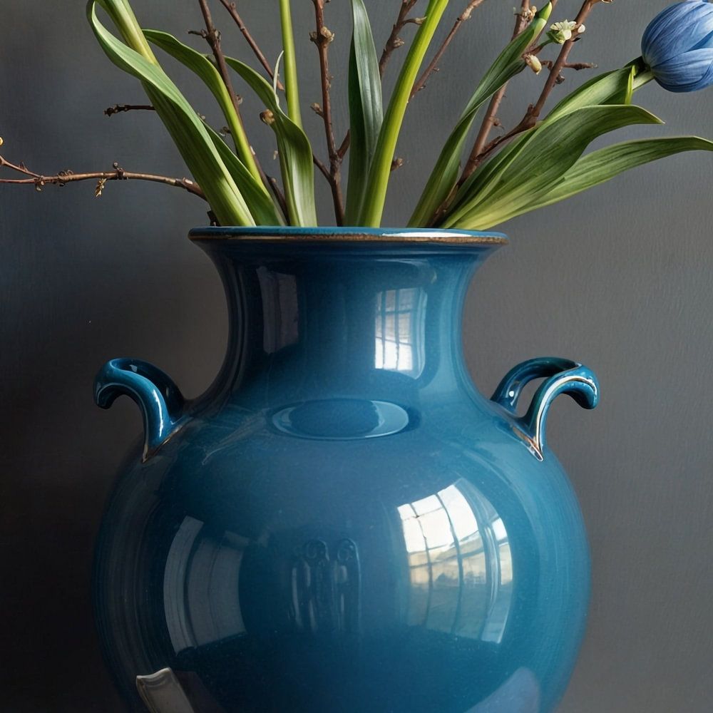 The painting shows a still life of a blue vase with blue tulips and dainty twigs, placed on an old wooden wall shelf. The deep colours of the flowers contrast with the weathered shelf and dark background. The light subtly captures the textures, creating an intimate, timeless atmosphere.