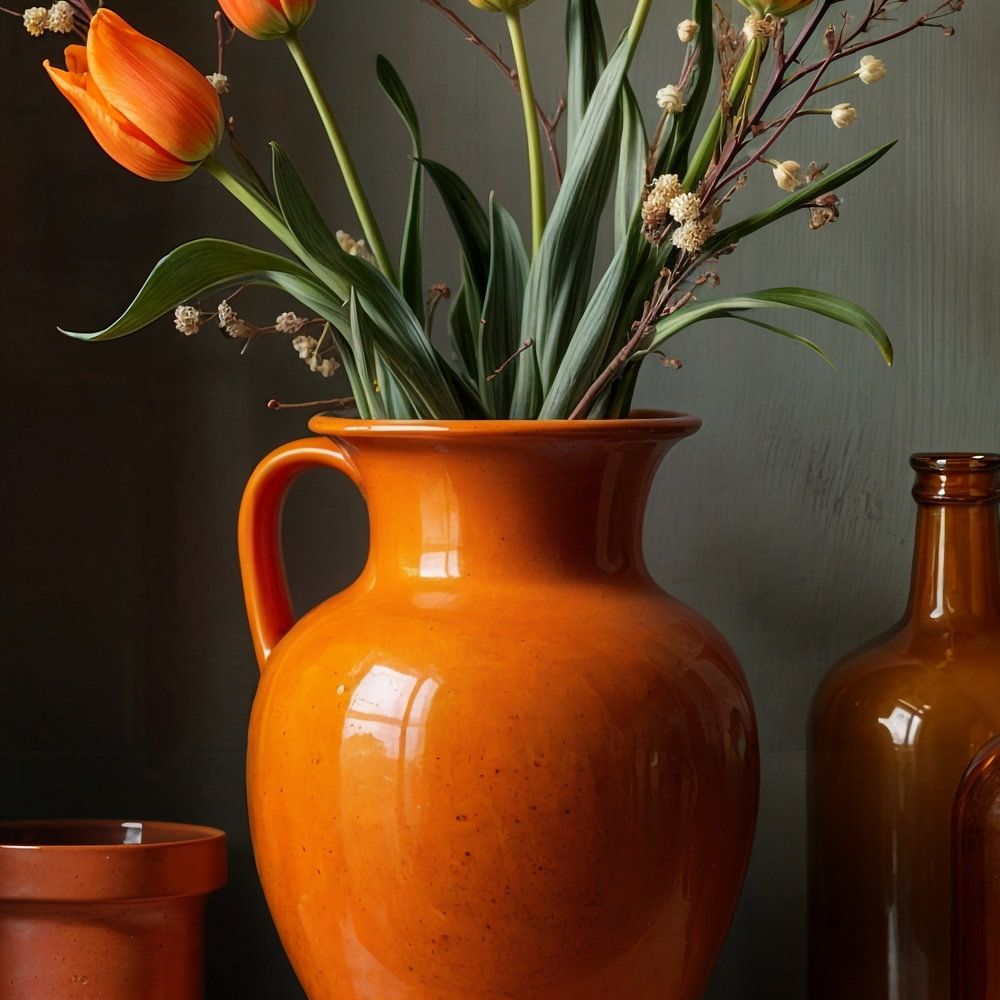 The painting shows a still life of an orange vase with orange tulips and decorative twigs, placed on an old wooden wall shelf. The deep colours of the flowers contrast with the weathered shelf and dark background. The light subtly captures the textures, creating an intimate, timeless atmosphere.
