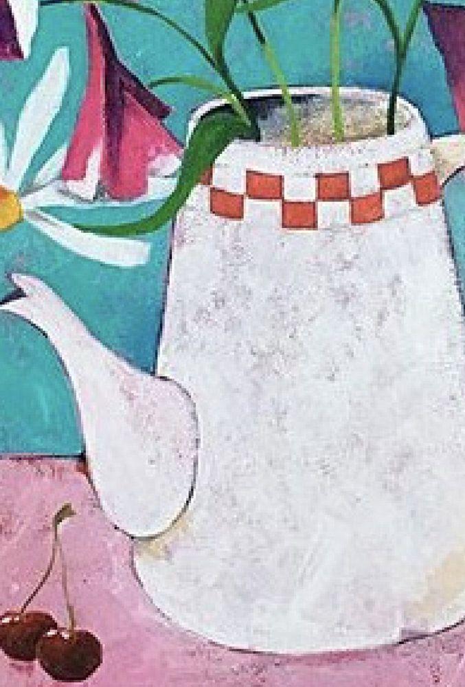 Buy this painting Still life with funny pink table and flowers by Eveline van Rooy as a reproduction on canvas, ArtFrame, poster and wallpaper, printed on demand in high quality.