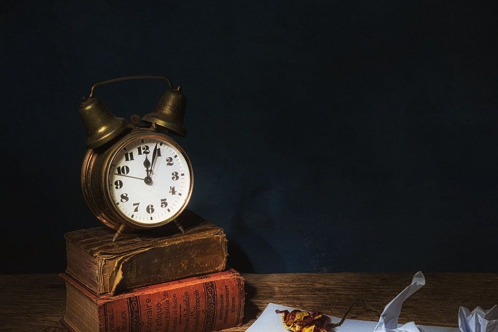 still life with humor, antique books , fountain pen and alarm clock.