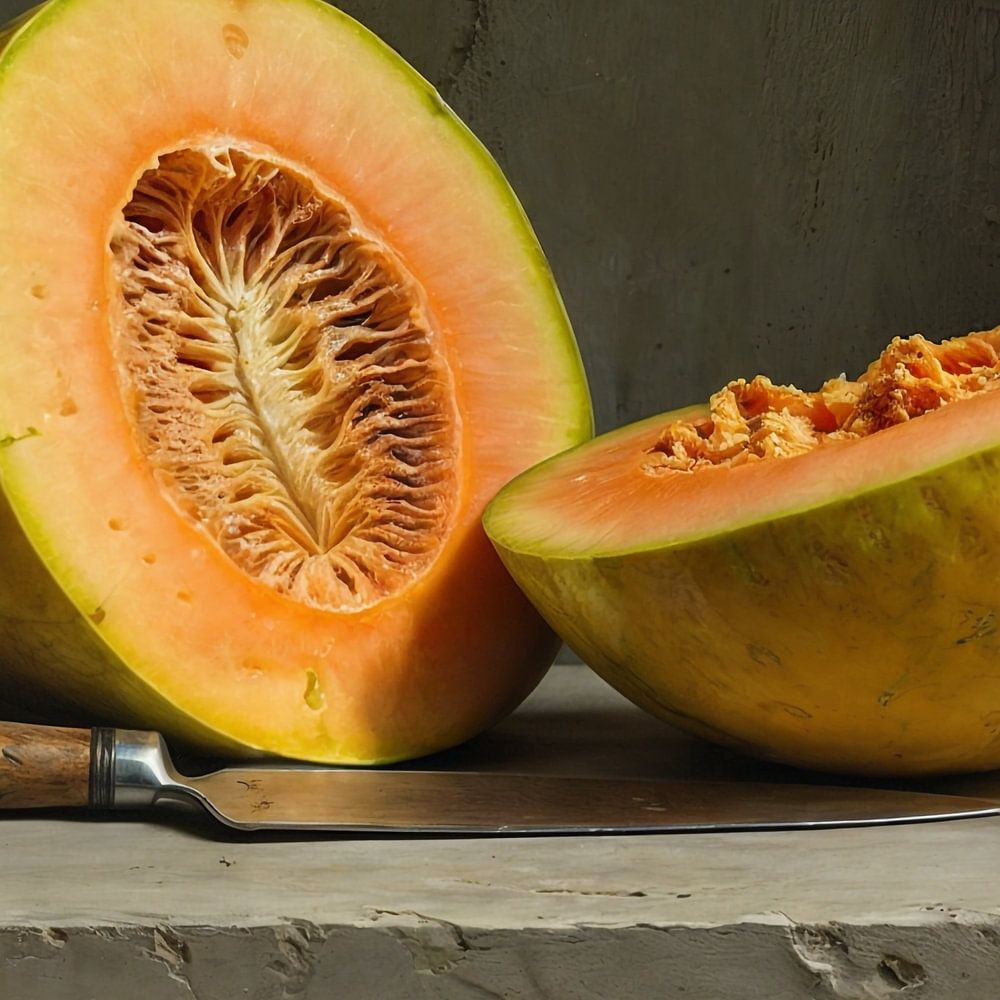The texture of the melon contrasts beautifully with the raw, industrial look of the concrete wall, highlighting the natural beauty of the fruit. Next to the melon is an old-fashioned knife, with a scuff mark on the wooden handle, evoking a sense of history and simplicity.