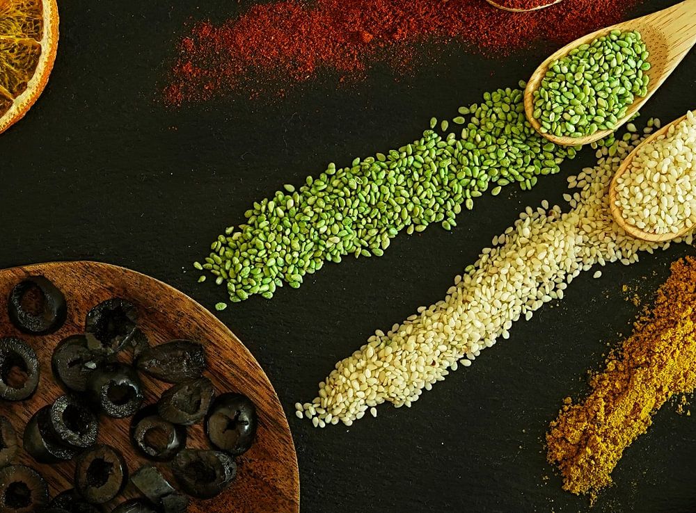 Colourful still life with black olives , spices , orange and basil um .