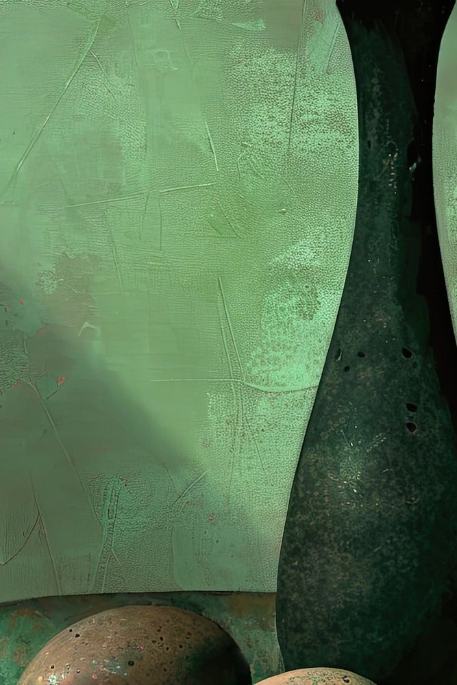 Still life - This still life painting shows a dark green, elegant vase and two speckled eggs resting on a worn bowl against a textural, greenish background.