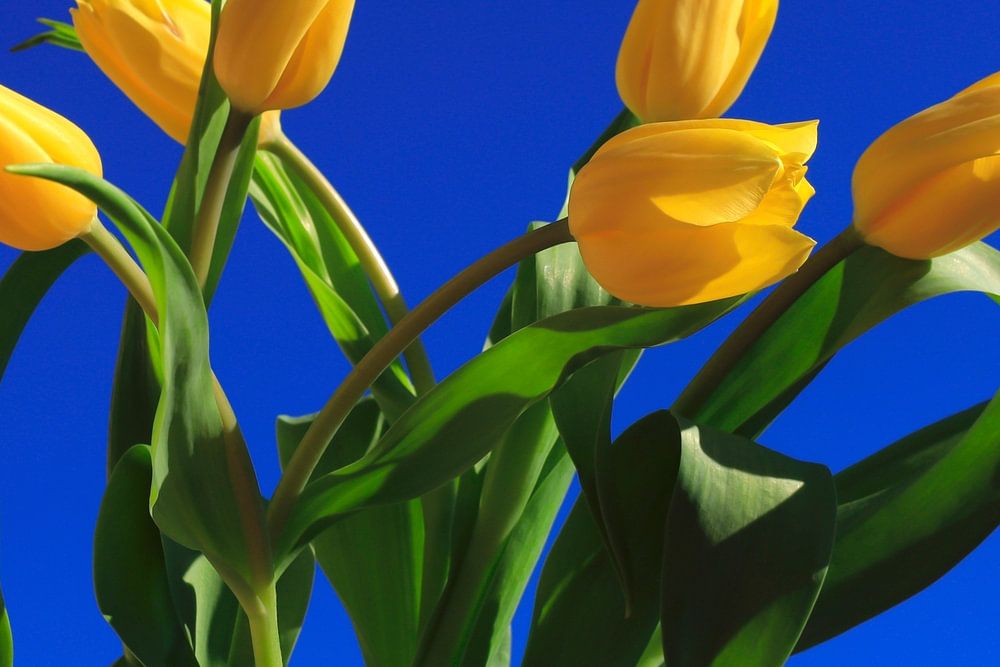 Yellow tulips shine against blue sky