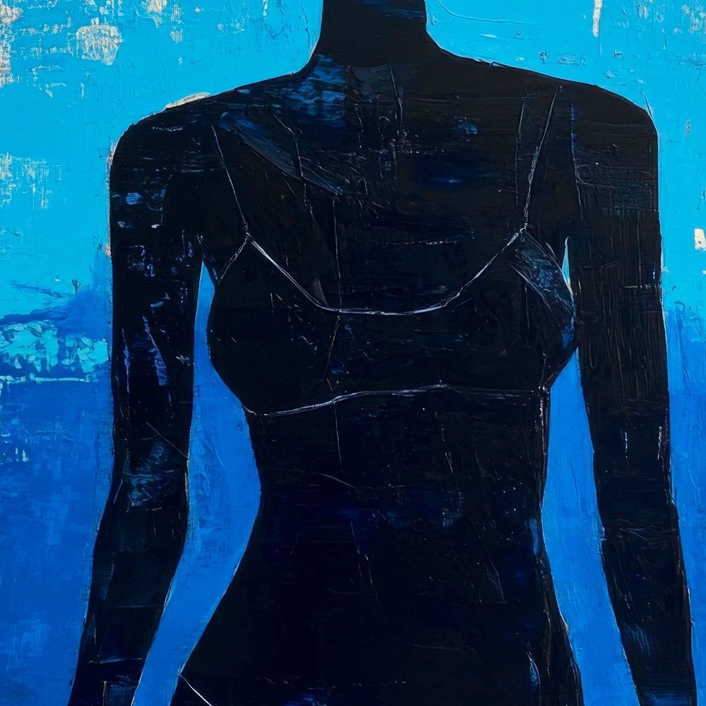 A stylised figure rises up against a bright blue background reminiscent of the sea. Her black silhouette radiates calm and strength, while the soft colours of the sky and water create a harmonious connection. The minimalist depiction leaves room for interpretation and invites you to immerse yourself in the depths of emotion.
