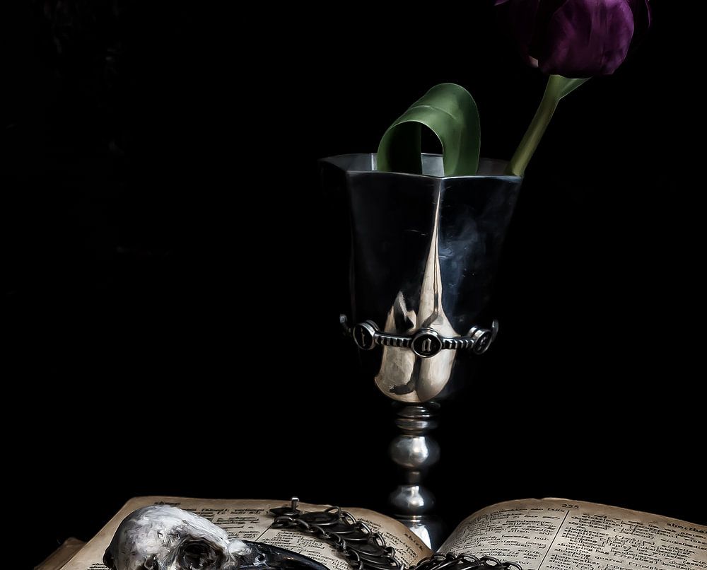 Stilleven van een boek met een vogelschedeltje, kelk en tulp in Low Key stijl en gemaakt met alleen natuurlijk licht. Prachtig voor aan de muur in een kantoor, hotel, woonkamer.